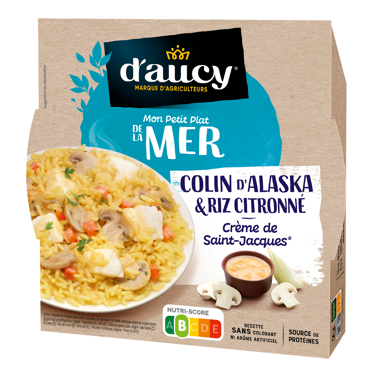 Riz préparé 46% (riz précuit, huile de colza, sel, zeste de citron, curcuma), colin d’Alaska 17,5 %, eau, brisures de noix de Saint-Jacques 4,5 %, champignons de Paris 3,9%, oignons 3,2 %, carottes, crème 2%, tomates, amidons, beurre, vin blanc, protéines de lait, sel, ail en poudre, persil, antioxydant : acide ascorbique, concentré de langoustine, épices.