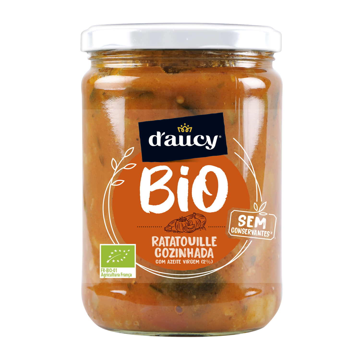 Courgettes*, tomates*, jus de tomates*, aubergines*, oignons*, purée de tomate double concentrée*, poivrons rouges*, poivrons verts*, huile d’olive vierge* (2%), sucre de canne*, sel de mer, amidon*, ail*, jus concentré de citron*, thym*, poivre*.
