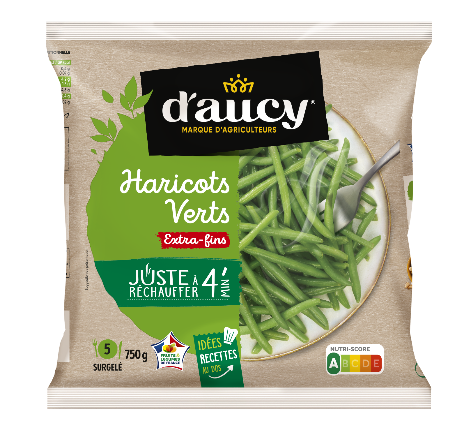 O nosso feijão-verde é cultivado em campo aberto em França e colhido na época ao atingir a maturidade certa. É pré-cozinhado e congelado para preservar todas as suas qualidades.