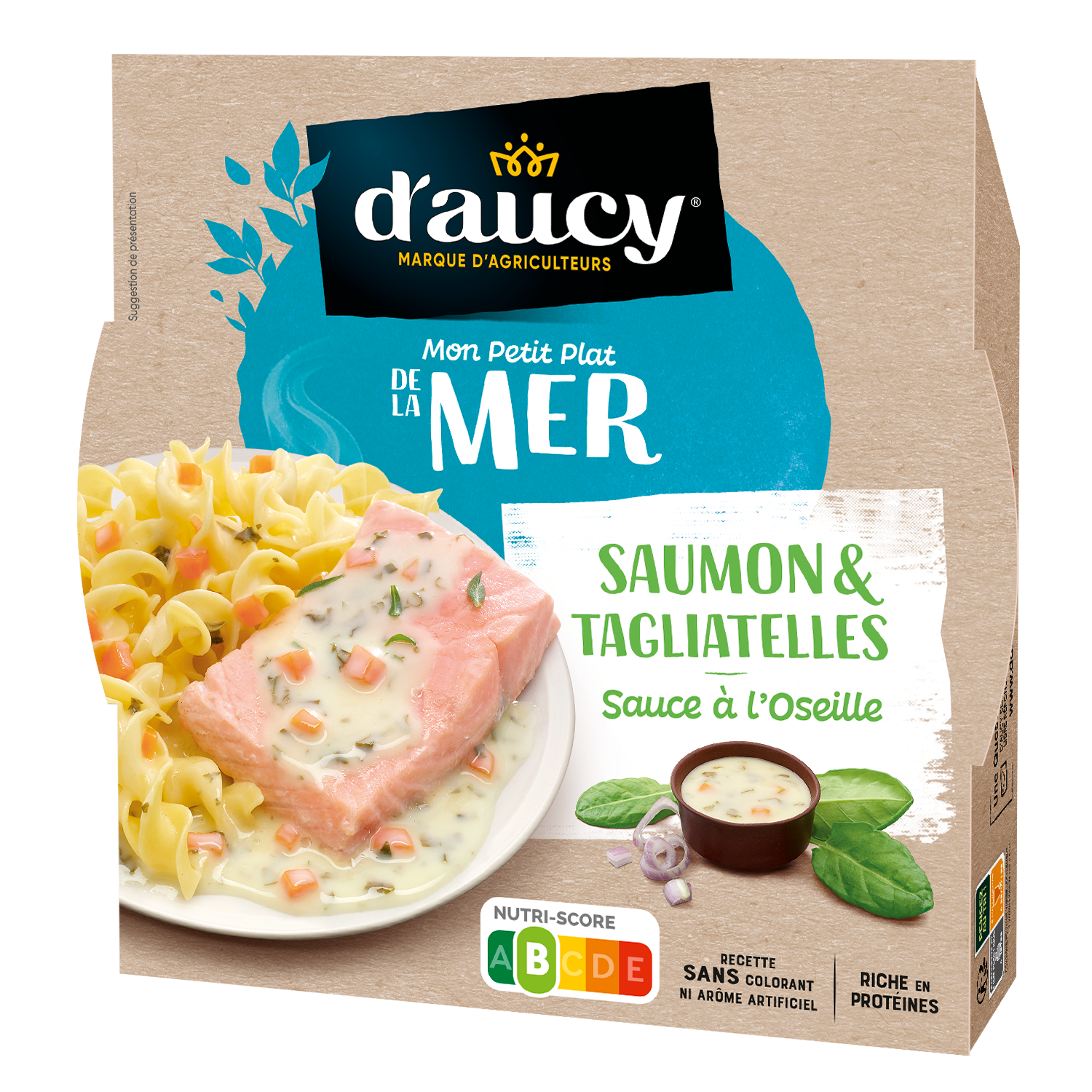 Massa tagliatelle preparada 37% (água, sêmola de trigo duro, ovos, óleo de colza, sal, vinagre de álcool), salmão 25%, água, nata, cenouras 3,4%, amidos, azeda 1,7%, chalota 1,5%, manteiga, sal, fibras vegetais, vinho branco, aroma natural de peixe, concentrado de sumo de limão, pimenta, aroma natural de tomilho, aroma natural de loureiro, curcuma.