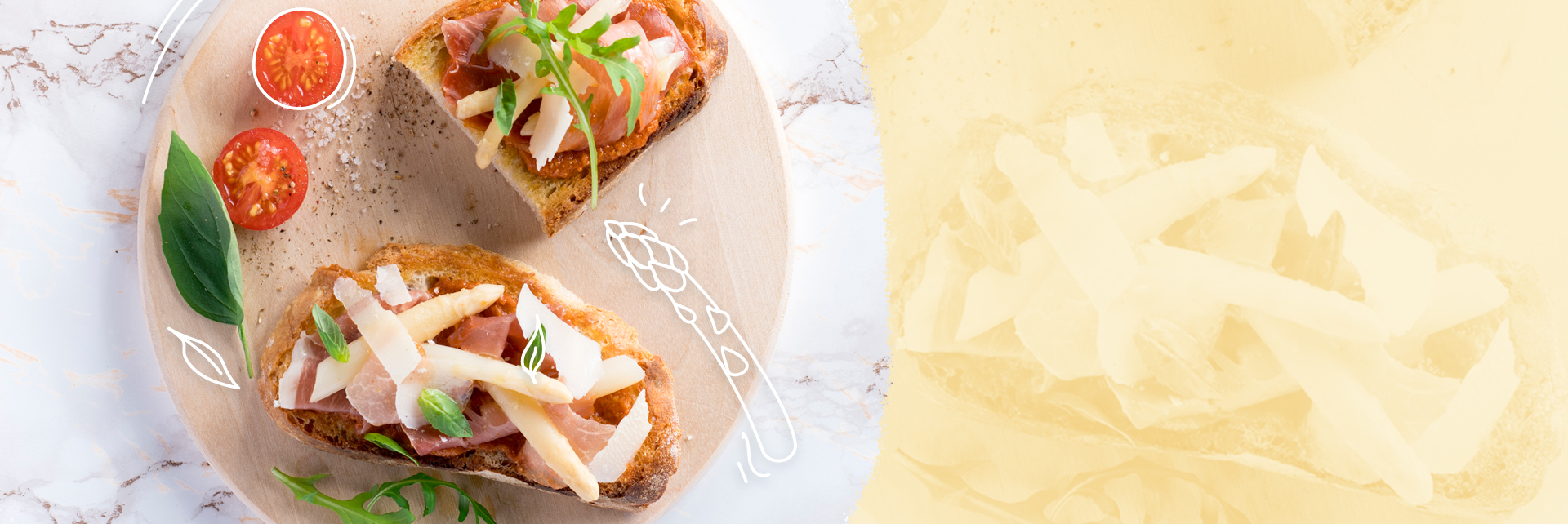Página inicial do sítio > Ideias de Receitas > Bruschettas de presunto de Parma e espargos
