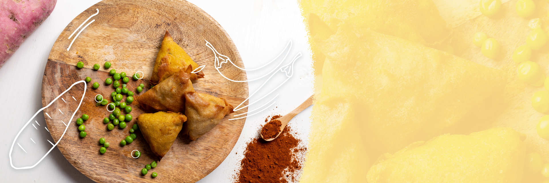 Página inicial do sítio > Ideias de Receitas > Chamuças de batata-doce, queijo feta e ervilhas
