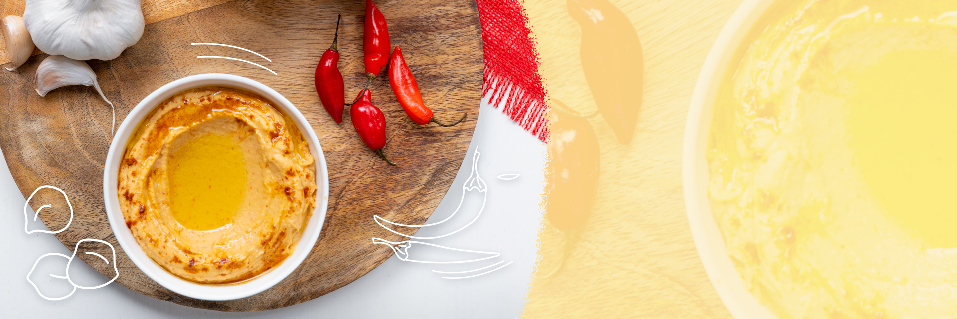 Página inicial do sítio > Ideias de Receitas > Húmus de grão-de-bico com duas pimentas