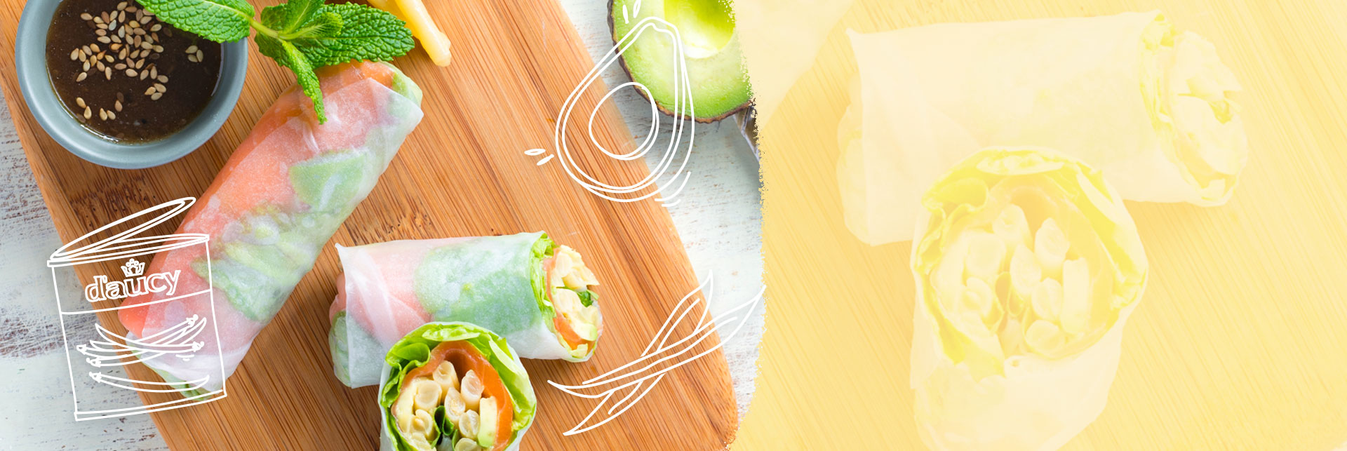 Página inicial do sítio > Ideias de Receitas > Rolos de primavera com feijão-manteiga, abacate e salmão fumado