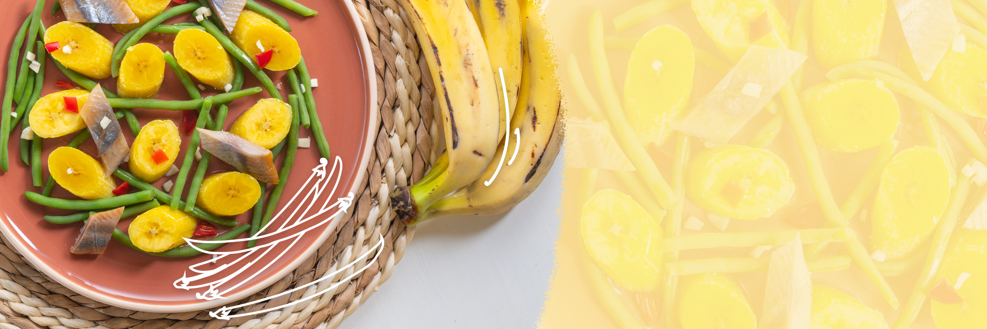 Salada de feijão-verde, banana-pão e arenque